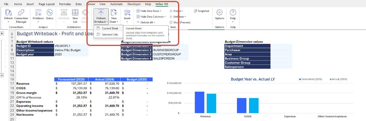 - Once you are happy with the values in the Forecast column, you are ready to write this data back to your ERP by clicking the Perform Writeback button and selecting Current Worksheet.